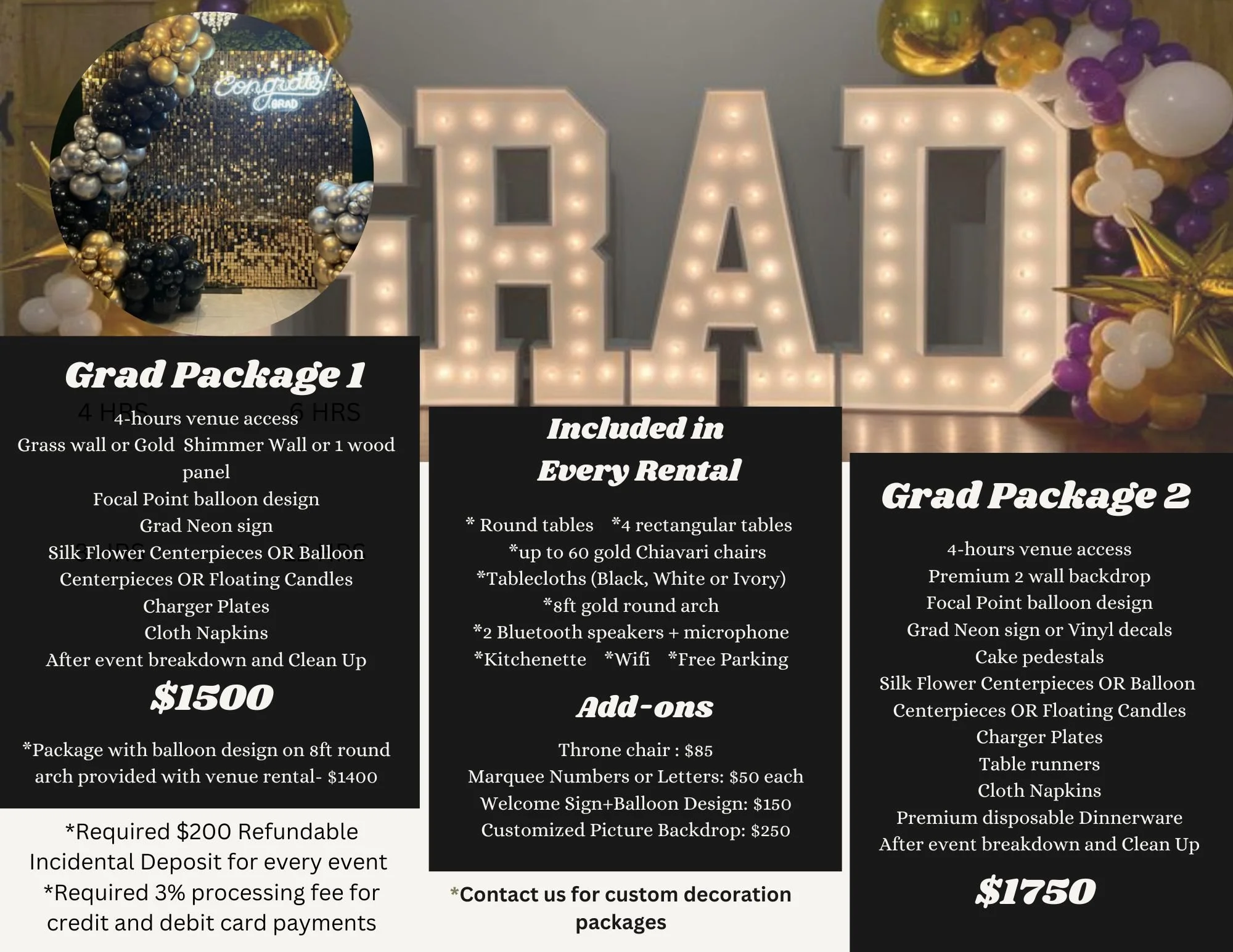 Cake pedestal, treats or gift table and buffet tables (bring treats and food)Welcome Sign60 Gold Chiavari Chairs3 Cocktail tablesSmart TVSurround Sound SystemKitchenetteCleaning included