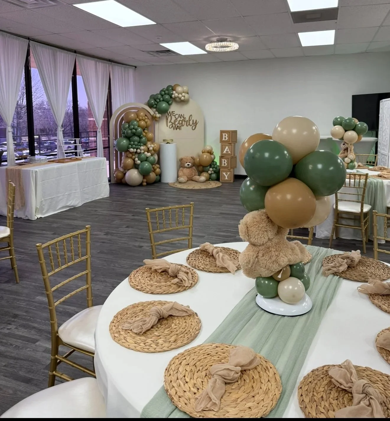 Table Decor:Option 1: Balloon centerpieces with teddy bears, blue or pink table runners, charger plates (3 options), cloth napkins (3 options)Option 2: Fake flowers centerpieces (3 options), blue or pink table runner), charger plates (3 options), cloth napkins (3 options)